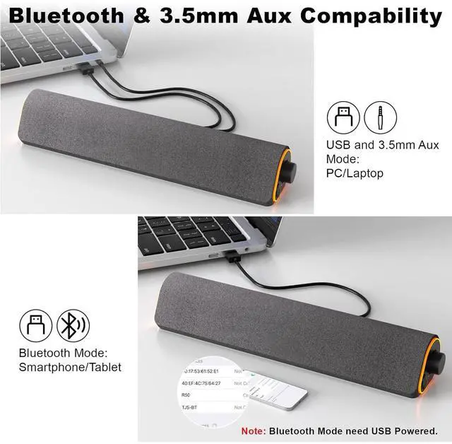 USB Mode: Plug into the USB port for power, press the "M" key to select "Aux Mode", the 3.5mm jack for sound. The soundbar is widely compatible with various devices such as PCs, laptops, tablets, smartphones and more