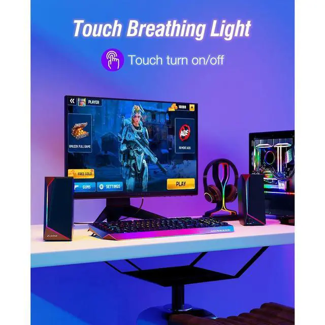 Touch Lights & Ultra Long Cable: Computer speakers increase the touch button to turn on/off cyclic lights. The cable between desktop speakers is 37 inches long to be placed on both sides of the monitor