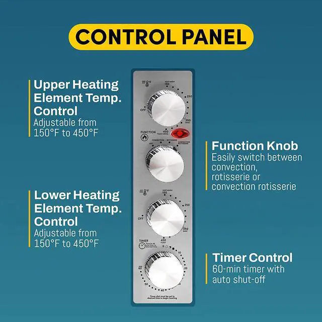 Independent Temperature Knobs up to 450°F to separately control top and bottom heating elements - turn on only one or both at the same time; 60-minute timer with signal turns oven off automatically