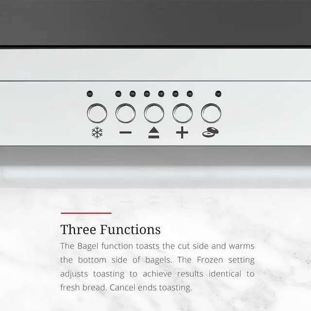 Three Functions - The Bagel function toasts the cut side and warms the bottom side of bagels. The Frozen setting adjusts toasting to achieve results identical to fresh bread. Cancel ends toasting.