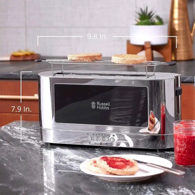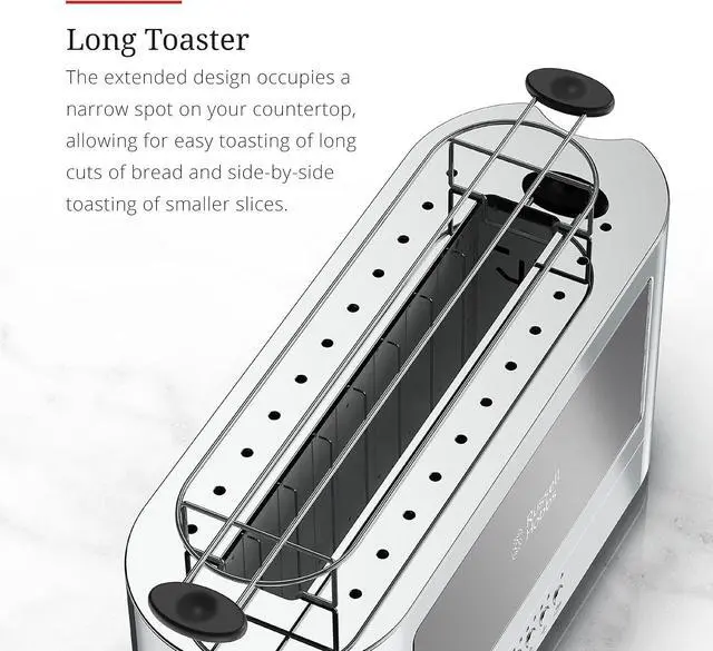 Long Toaster - The extended design occupies a narrow spot on your countertop, allowing for easy toasting of long cuts of bread and side-by-side toasting of smaller slices.