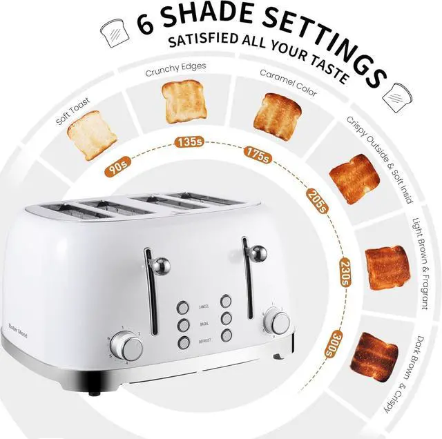 6 Shade Settings: 6 level adjustable brown settings from light to dark to meet everyone' s taste, 1650W high power & 360°baking mode will toast on both sides evenly and get hot fast