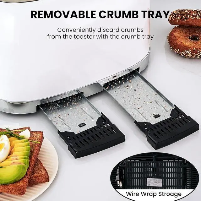 Easy to Use & Clean: This 4 slice toaster makes 2 toasters in one to save your time for toasting. You can make your breakfast more easily. 2 removable crumb trays make cleaning quickly and cord wrap storage makes no mess
