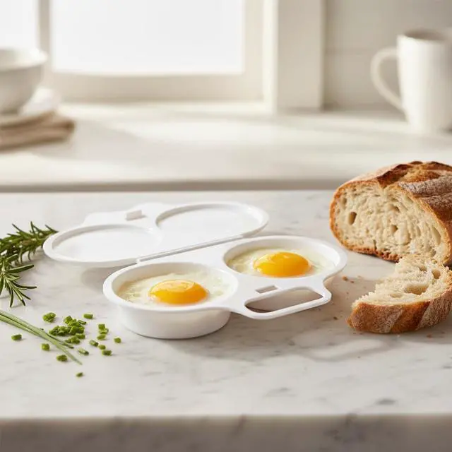 Everything needed for perfect microwave poached eggs. The heat-resistant handles provide safe handling, while the drainage channels create ideal egg texture.