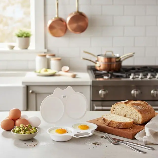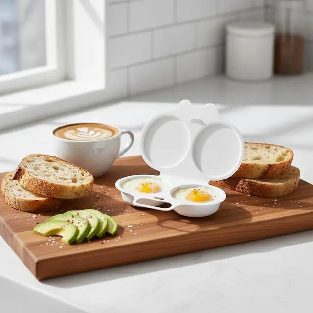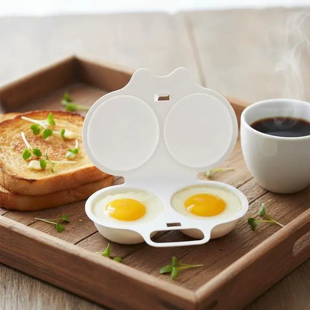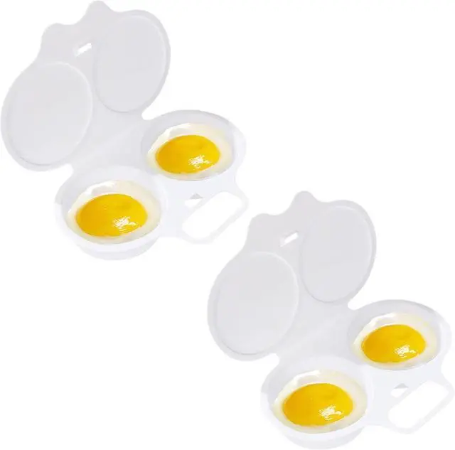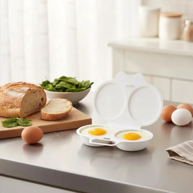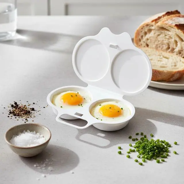 Transform your morning routine with this convenient 2-piece white egg poacher set designed for microwave cooking. Each poacher features two cavities for preparing multiple eggs simultaneously, complete with a fitted lid for optimal results. The nonstick surface ensures your poached eggs slide out effortlessly, while the thoughtful double drain design helps achieve the perfect consistency. Measuring 13 x 5 cm, these compact egg cups are ideal for quick, hassle-free breakfast preparation. The durable cookware construction makes these poachers a practical addition to your kitchen arsenal, perfect for creating restaurant-style poached eggs in minutes. Whether you're preparing eggs Benedict or a protein-rich breakfast, these microwave egg poachers deliver consistent results while saving time and effort.