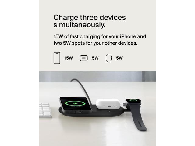 - 3-IN-1 CONVENIENCE - Simultaneously charges your iPhone (up to 15W), Apple Watch (up to 5W), and wireless charging earbuds (up to 5W), streamlining your charging setup and reducing cable clutter.