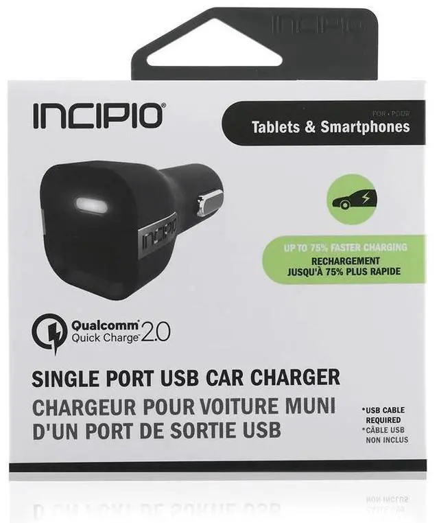 Incipio Technologies - Auto Charger - 2.0 Quick Chargein Black Incipio s Qualcomm Quick Charge 2.0 enabled car charger (Black) provides more raw power in less time than a traditional charger for rapid charging even during the shortest of car rides. The Qualcomm Quick Charge 2.0 enabled car charger is made of premium materials with a sleek matte finish. The Quick Charge 2.0 enabled car charger is sure to keep your mobile devices powered up and ready to go!