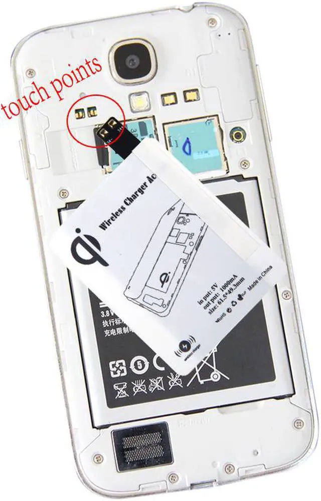 Step 2: Stick the receiver card to the mobile phone's battery and the two protuberant touch points must touch the two recesses next to the battery;