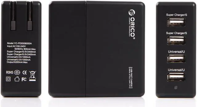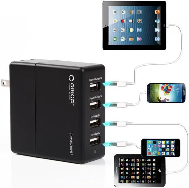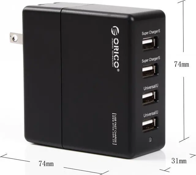 Provides two 5V2.4Amps Super Charger USB ports and two 5V1A Universal Charger USB ports. ORICO Super Charger charges four phones or tablets at the same time. Four ports deliver max Power 5V7Amps @ 35 Watt allowing two tablets and two cell phones charging with max speed, saving hours of your time.