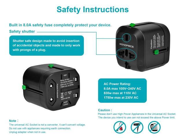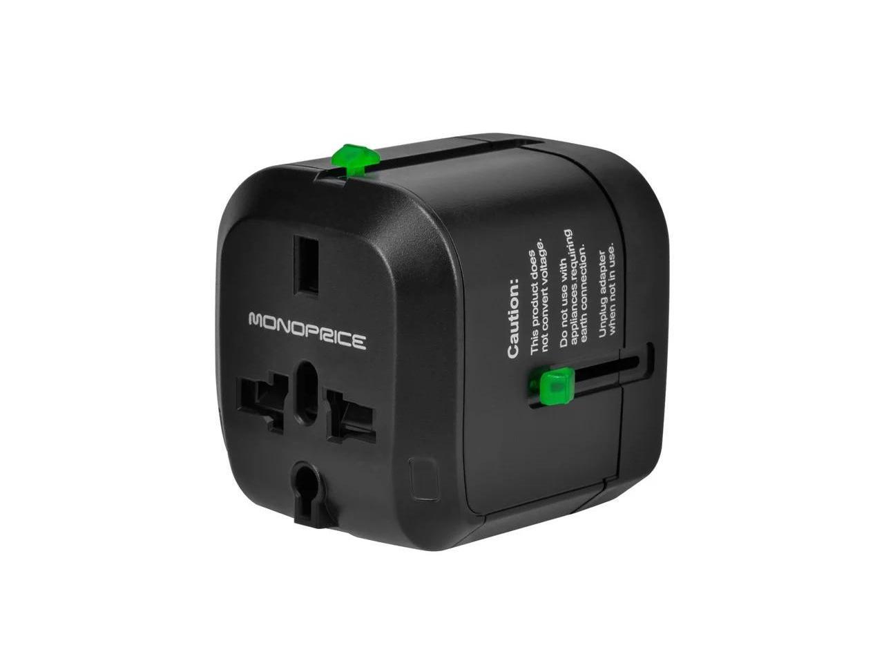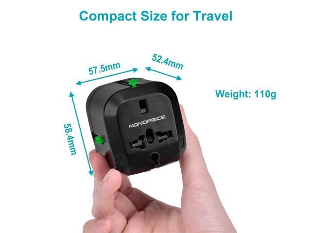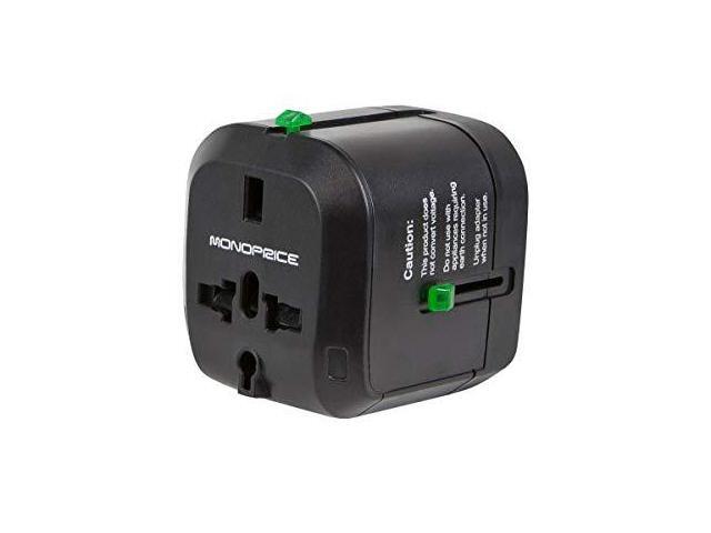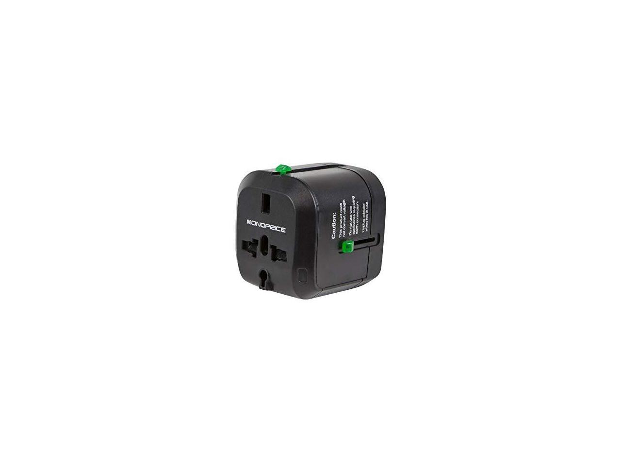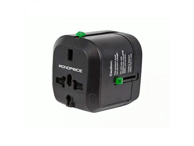 - The Compact Cube universal travel adaptor from Monoprice ensures that you can plug any device into any power socket.|This is a blade adaptor in that it allows you to adapt the plug blades of any device to that of the local power wall socket.|The face of the adaptor accommodates two- and three-bladed power plugs from the US UK EU Australia and China.|The adaptor is rated for 8amps and can handle 830 watts of power (at 110 VAC) or 1750 watts (at 230 VAC).