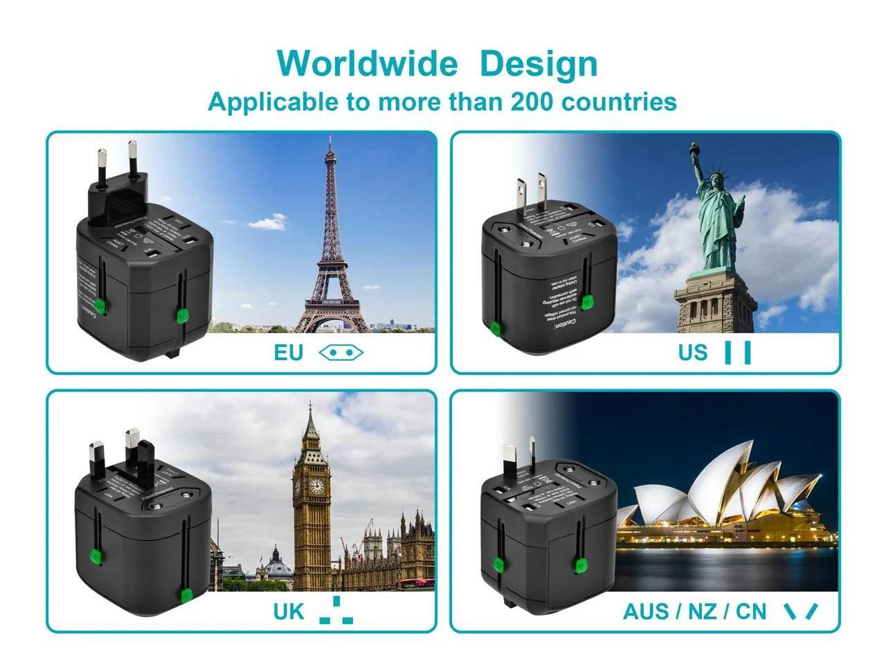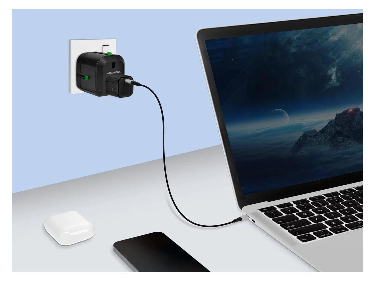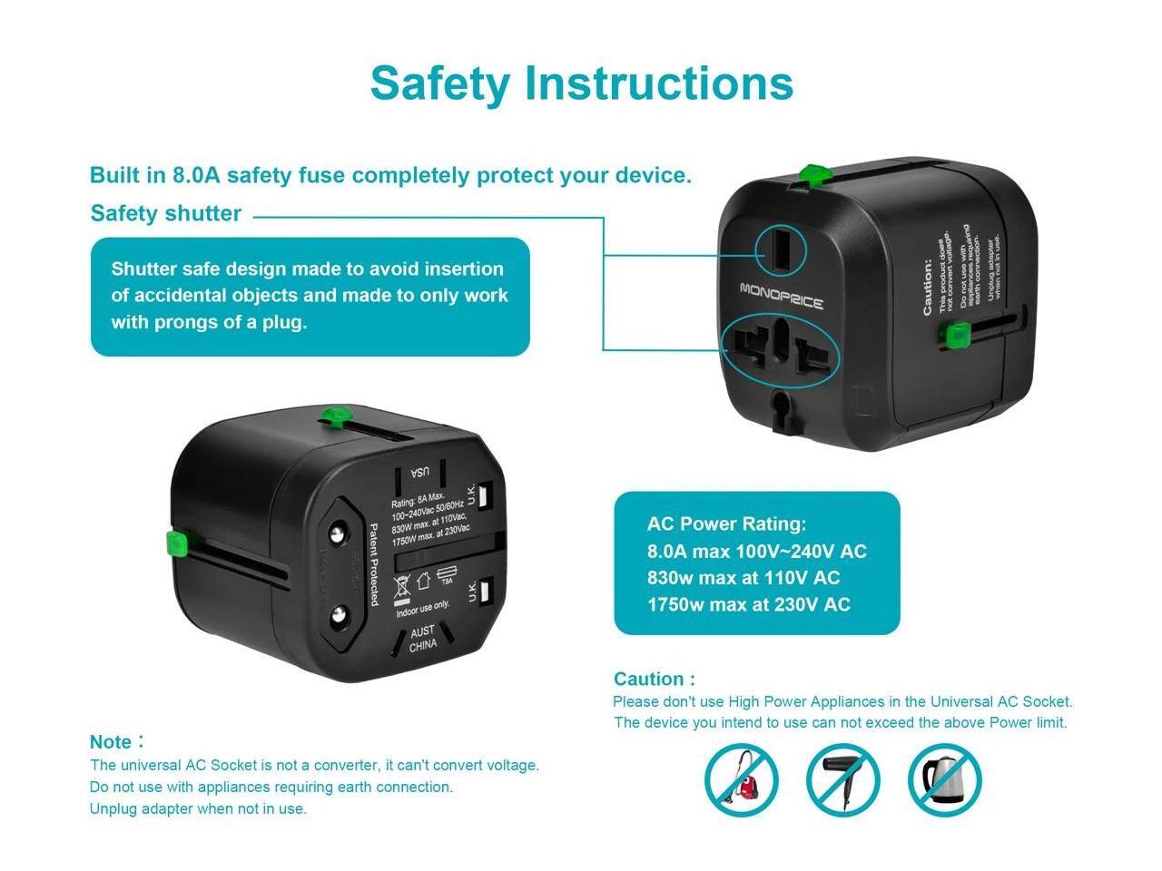 - The Compact Cube universal travel adaptor from Monoprice ensures that you can plug any device into any power socket.|This is a blade adaptor in that it allows you to adapt the plug blades of any device to that of the local power wall socket.|The face of the adaptor accommodates two- and three-bladed power plugs from the US UK EU Australia and China.|The adaptor is rated for 8amps and can handle 830 watts of power (at 110 VAC) or 1750 watts (at 230 VAC).