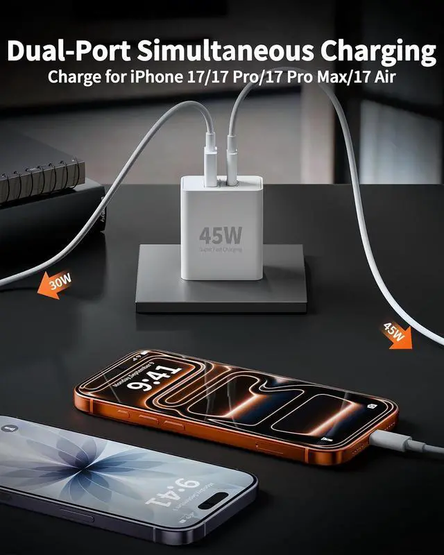 Fast Charging for iPhone 17: WODENTA USB C charger block adopts the 2025 upgraded PD 3.0 fast charging technology with a maximum output power of 45W. Charge for your iPhone 17 series up to 50% in just 20 minutes. It can also fast charge for your iPad Watch AirPods Android Phones and other USB-C devicesDual-Port