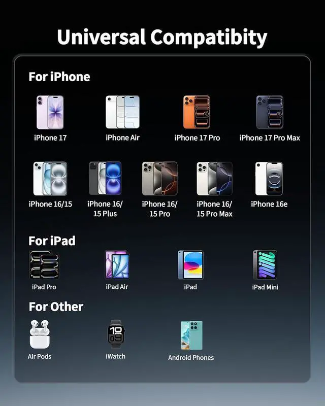 Compatibility: The 45W USB-C & USB-A wall charger is compatible with mobile phones tablets smart watches and other USB-C and USB-A devices. Compatible with iPhone 17/17 Air/17 Pro/17 Pro Max/16/16 Plus/16 Pro/16 Pro Max/16e/15/15 Plus/15 Pro/15 Pro Max iPad Pro 13/ 12.9 /11 inch iPad Air 6th/5th/4th iPad Mini 6th iPad 10th Generation/A16 Galaxy S25/S24/S23/S22/S21 Moto Pixel LG Android and moreWhat