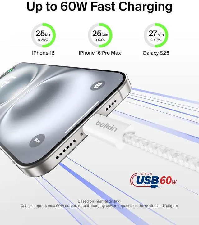 FAST CHARGING FOR YOUR DEVICES: The Belkin BoostCharge USB-C Cable delivers 60W of power to fast charge your iPhone 16 from 0-50% in as little as 25 minutes* as well as charge a Galaxy S25 Google Pixel 10 and more at lightning speeds.