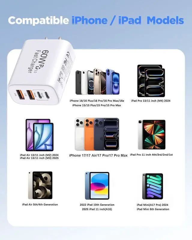 Equipped with 2 USB to USB C Charging Cable Cord the Charger USB C provides max 5A super charging speed and 480Mb/s transfer speed. Reliability iPhone Charger 10FT Fast Charger USB CThe 60W Charger Block and 10FT USB C to C cable equipped with a smart chip which can just the input power of the iPhone automatically matches the current required by your device preventing it from short-circuiting over-current over-voltage overheating and over-charging. 10Ft USB C Cable and Block Universal CompatibilityThe 60W USB C Charger Kit is Compatible with iPhone 17/17 Pro/17 Pro Max iPhone 16/16e/16 Plus/16 Pro/16 Pro Max iPhone 15/15 Plus/15 Pro/15 Pro Max iPad 10th Gen iPad mini6 iPad pro 11 inch iPad pro 12.9 in iPad pro 2nd Gen/11 inch iPad pro 4th/ 12.9 inch iPad pro 3nd/11 inch iPad pro 5th/ 12.9 inch iPad pro 4td Gen/11 inch iPad pro 6th/ 12.9 inch iPad Air 4/5 and other Type C Devices.