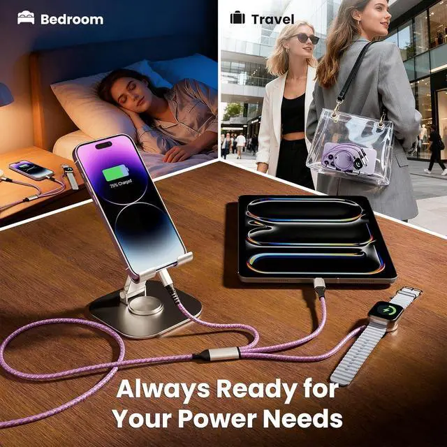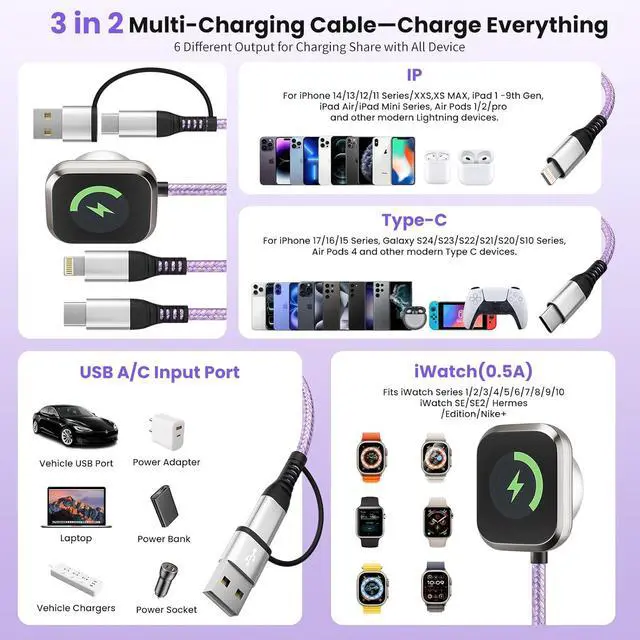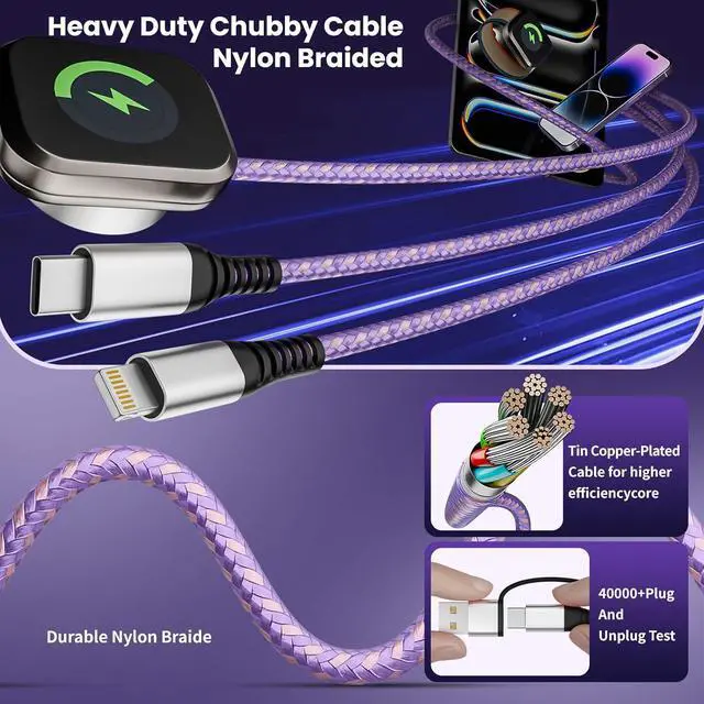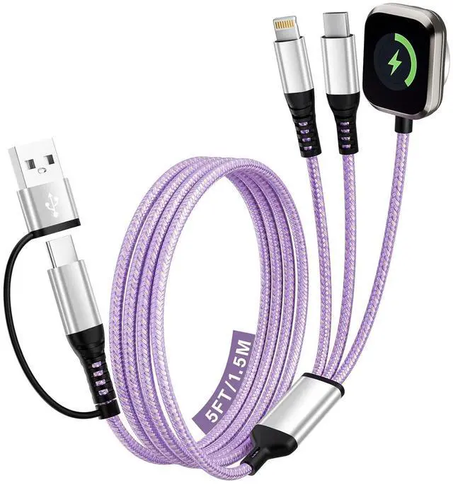 (Note: To avoid getting hot we recommend removing your watch case before charging. Only compatible with iWatch)[Military-Grade Durability] Tired of usb c cables that break or overheat? Our phone charger cord is built to last. The USB C/A connector can withstand 40 000+ plug and unplug tests. The rugged nylon braid prevents tangles and fraying while the reinforced aluminum connector withstands drops and bends. Inside high-purity tinned copper ensures fast stable charging with built-in protection against overheating. The ideal worry-free charging companion for travelers students and professionals. [Compatibility and Style Combined] This multiple charging cord for all devices excels in both form and function. Its stylish purple and rose gold braided design makes it stand out yet beneath its elegant exterior lies broad compatibilitysupporting iPhone 17/16/15/14/13/12/11 Pro/Pro Max iWatch Ultra/SE/112 Android Galaxy iPad and more. This makes it perfect for fashion-forward young people. Let this app-le watch charger add a splash of vibrant color to your tech-savvy lifestyle. [5FT ideal length and weight] The 5 FT length strikes the perfect balanceno worries about cables being too short to charge your phone while lying in bed or tethering you to the outlet nor concerns about excess length causing tangles and storage hassles.