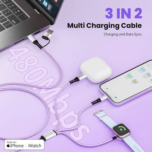 [Upgrade 3 in 2 Multi Charging Cable] Upgrade your charging game with this stylish 3 in 2 multi charging cable perfectly charge for your iPhone and iWatch! The usb to usb c cable has an extra USB-A adapter fitting some airline seats and hotel TVs with USB-A slots. Instead of shelling out for separate chargers for your iWatch and iPhone. The travel charger for multiple devices compatible with all iWatch Series & iPhone 17-6 making it airplane travel essentials for Multi-device users! [Charging and Data Transfer in One] This charging cables for multiple devices not only supports simultaneous charging for three devices but also boasts powerful data transfer capabilities with speeds up to 480Mbps.