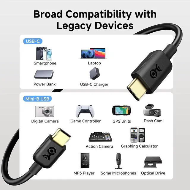 Broad Compatibility: This USB Mini B to USB C cable works with MP3 players Canon PowerShot cameras PS3 controllers Garmin and TomTom GPS units GoPro Hero cameras car dash cams Blue Snowball iCE USB Mic Blue Yeti USB Microphone Graphing Calculator TI-84+ CE and more.