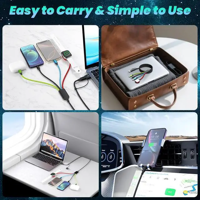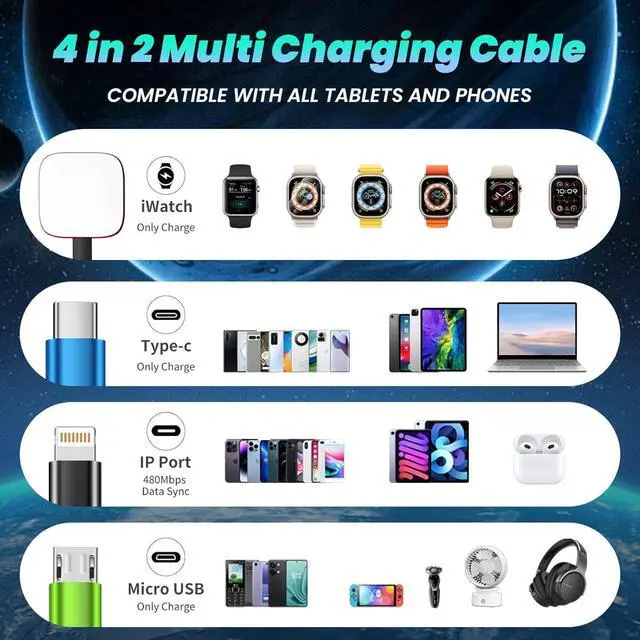 4-in-2 Multi Charging Cable All-in-One Travel Solution Combining USB A and USB C input with Lightning USB-C Micro-USB and iWatch charger outputs this versatile 4-in-2 cable powers multiple watch and Android devices simultaneouslyideal for iPhone 175 iWatch Ultra/SE/112 iPad and Galaxy S25S21. One cable covers all your charging needs. (iOS connectors support data sync only 480Mbps) Travel Accessories Travel Essential Compact & EssentialBuilt for on-the-go charging this 5FT multi charger is lightweight portable and tangle-resistantperfect for travel car rides hotels cruises or airport lounges. An everyday carry for digital nomads commuters and vacationers alikeStable Transmission - 480 MbpsThis 4 in 2 watch charger delivers stable voltage and current protection ensuring your devices are charged safely at maximum speed.