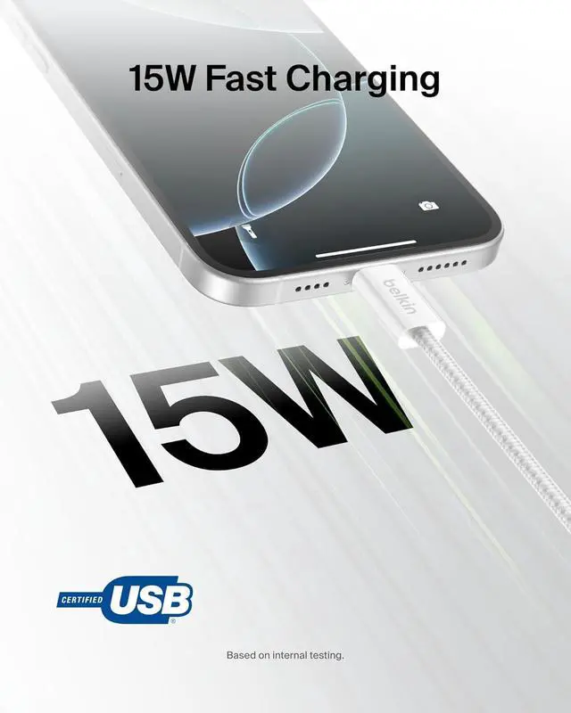 FAST CHARGING FOR YOUR DEVICES: The Belkin BoostCharge USB-C Cable delivers 15W of power to fast charge your iPhone 16 from 0-50% in as little as 45 minutes* as well as charge a Galaxy S25 Google Pixel 10 and more at sufficient speeds.