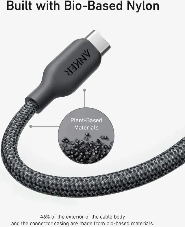 Bio-Based Nylon: 46% of the exterior of the cable body and the connector casing is made from bio-based nylon. Using bio-based nylon in our cables allows us to cut down on petroleum-based plastic such as TPE.