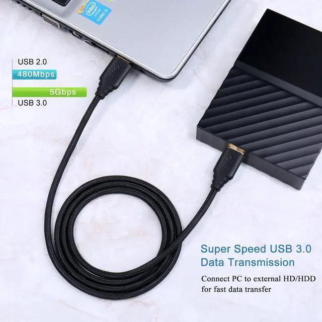 USB CABLE: Tested 8000+ bend lifespan Sturdy nylon braided jacket and corrosion-resistant gold-plated connectors adds higher durability and maximum conductivity for daily usage. Short usb 3.0 type a cable with upgraded connector is easy for plugging and unplugging and fits into usb 3.0 type a port very nice and snug.