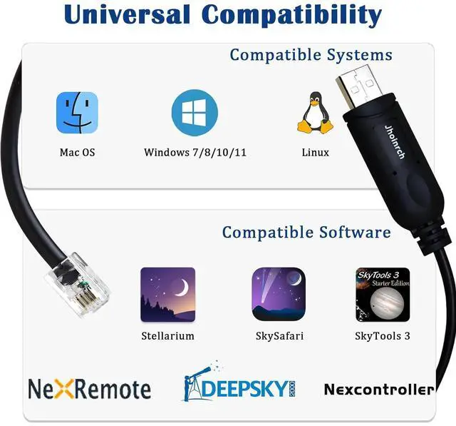 SLT/NexStar GT Series: e. g. 80GT 90GT 102 GT 114GT 130GT. Advanced VX Equatorial Mount. [Compatible Software]Compatible with dozens of mainstream astronomy software including Starry Night SkySafari NexRemote Stellarium SkyTools 3 Nexcontroller DeepSky and more. Not for CPWI)[FT232RNL Chip]Equipped with the FT232R chip offering higher stability and broader compatibility. It is compatible with Windows 7/8/10/11 Linux Mac OS as well as iOS and Android systems. If the driver cannot be installed automatically please refer to the manual for instructions on manual download and installation. [Buyer Support] Jhoinrch provides lifetime technical support for this usb to rj9 Cable one year product replacement and any questions you may have will be answered within 1 business day