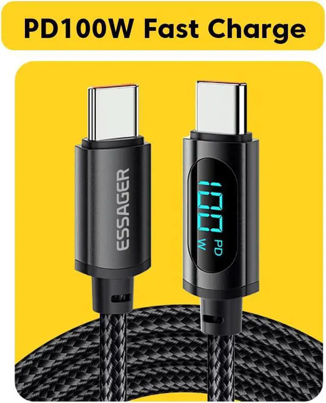 100W SUPER FAST CHARGING: Essager 5A/20V PD 100W fast charging cable takes the charging speed to the next level. The fast charge can charge a Samsung S20 from 0 to 80% in 30 minutes. It can also charge a MacBook Pro 16" from 0 to 40% in 30minutes. Please use a wall charger that supports fast charging. LED REAL-TIME POWER DISPLAY: Essager Type-C to Type-C cable can display the charging power in real time, allowing you to monitor your device in real time, bid farewell to the anxiety of unknown charging rate, and give your mobile phone/computer/tablet the safest protection. You have the highest technological experience. SMART E-MARKER: Essager USB-C to USB-C fast charging cable has a built-in E-Marker chip, which can intelligently identify the charging protocol of mobile phones/computers/tablets/gamepads, and provide 18W/30W/45W/60W/65W/96W/100W power according to the highest charging protocol supported by the device. The E-Marker chip ensures the fastest and most suitable performance for the device and guarantees the safety of the device. SUPER DURABLE: Premium nylon braided USB C to C cable with zinc alloy material reinforced connector provides long life and tangled-free performance. The strain relief design and sturdy aluminum shield make the cable durable and reliable. UNIVERSAL COMPATIBILITY: Essager USB C to USB C fast charging cable compatible with all C-C devices: phones, tablets, and laptops. Such as Samsung S22/S21+/S21/S20/Note 20 Ultra/Note10; MacBook Air/Pro 13''; iPad Pro 2021/2020/2019/2018; iPad air 2020; Dell XPS 15/13, Google Pixel 6/4/4 XL/3XL/3a/3a2/2XL; Nintendo Switch; Kindle and more (see description).