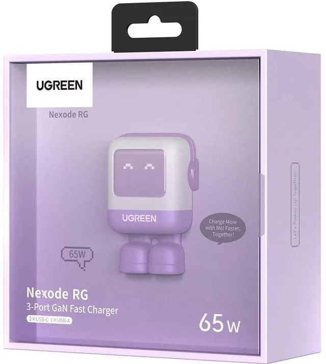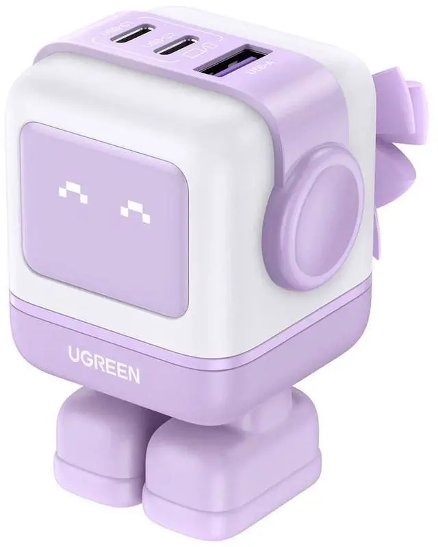 Take your charging experience to the next level with the Uno Robot 65W 3-Port USB GaN Fast Charger in a vibrant purple finish. This innovative charger combines functionality with a playful robot design, making charging your devices not only efficient but also fun. Equipped with two USB-C ports and one USB-A port, this versatile charger is capable of fast charging a wide range of devices, including smartphones, tablets, and even USB-C laptops, all from a single charging hub. Harness the power of 65W fast charging with this GaN (Gallium Nitride) technology charger, which can power your MacBook Air M2 from 0 to 51% in just 30 minutes using a single USB-C port.