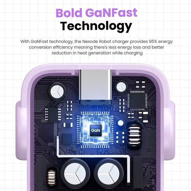 Safety is paramount with the Uno Robot charger, which is equipped with a comprehensive safety system. It includes built-in short circuit protection, overcharge protection, overheat protection, and surge protection, ensuring your devices are charged safely and securely. Embrace the cutting-edge GaNFast technology, which offers an impressive 95% energy conversion efficiency. This means less energy is wasted, and heat generation is minimized during charging, making it an eco-friendly and efficient choice for all your charging needs.