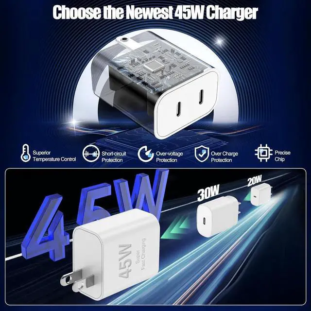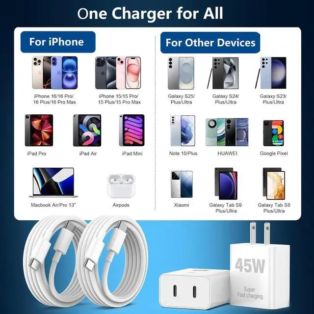 USB C Fast Charger 45WFor iPhone 17 Pro max, iPhone 17 Air, iPhone 16e, iPhone 15 Plus charges in 30 minutes Approx 50%, thanks to high tech charger technology for the usb c power adapter 3.0. charger plug compatible for iPad fast charging.usb c plug rely on enormous performance with pd 3.0 technology. 45W iPad adapter can charge up to 3 times faster than original adapter, enjoy full power at full speed. Are you pressed for time? With only 30 minutes charging time, you will get enough power.