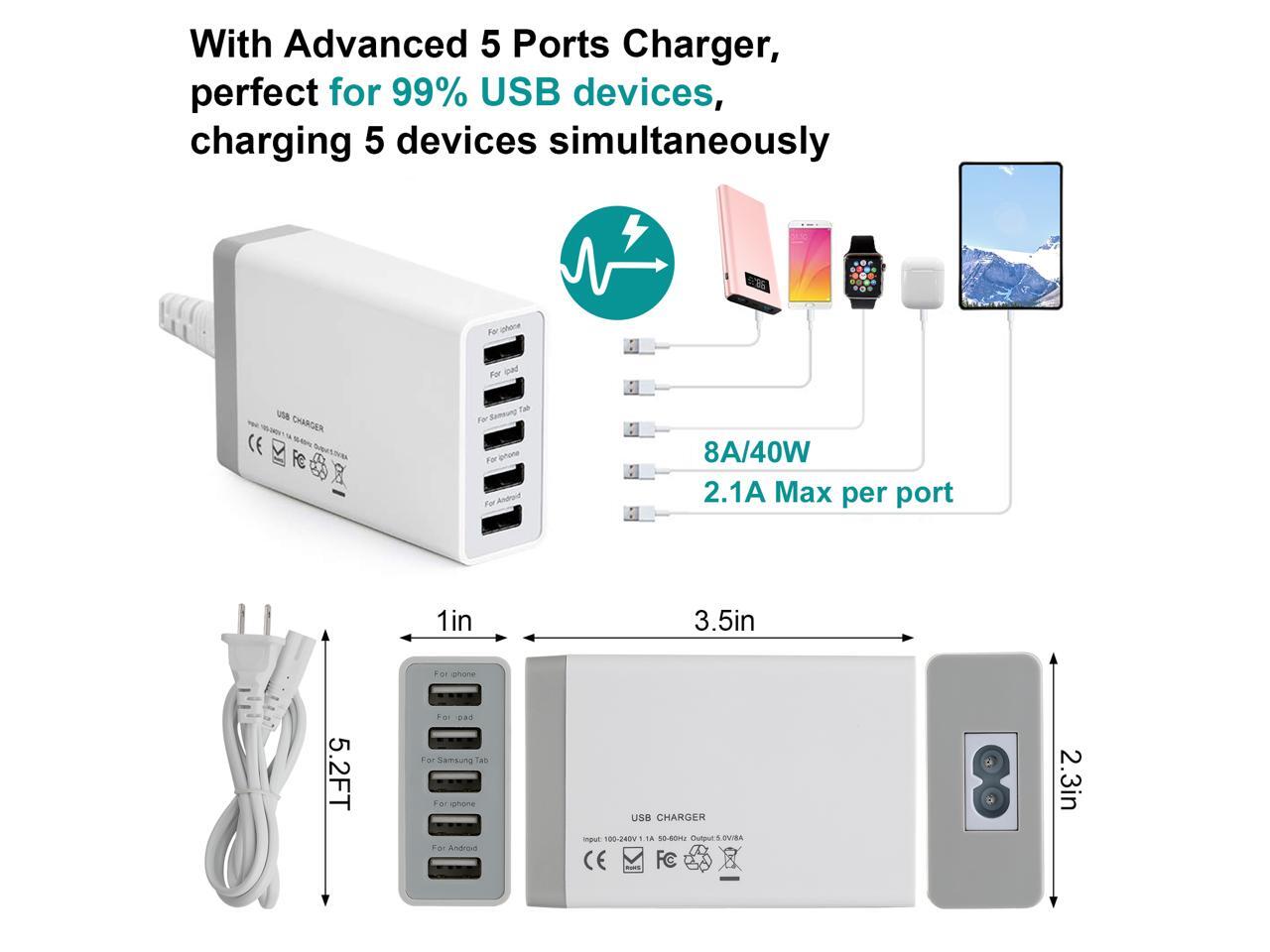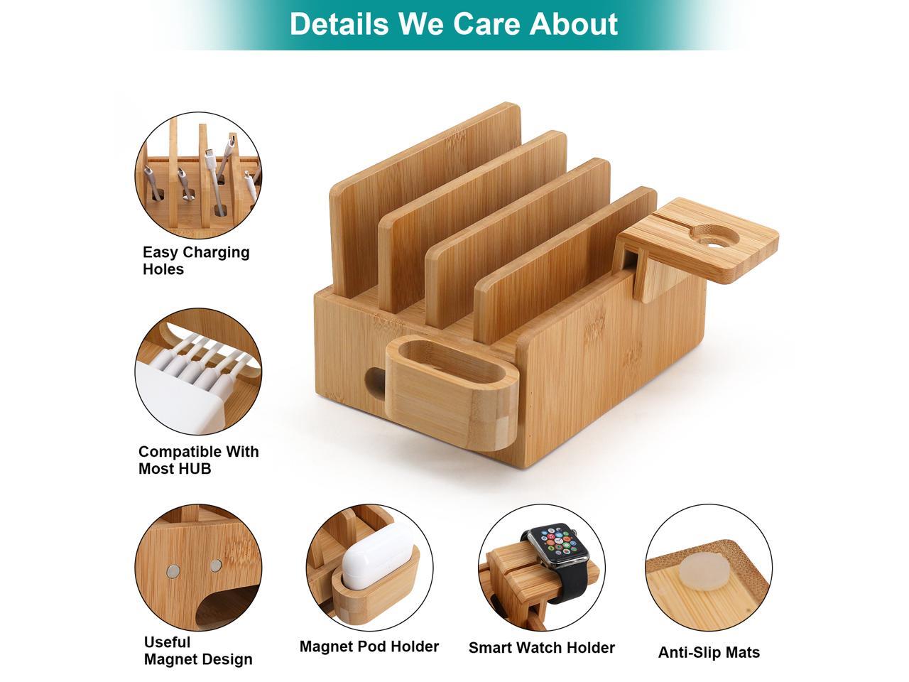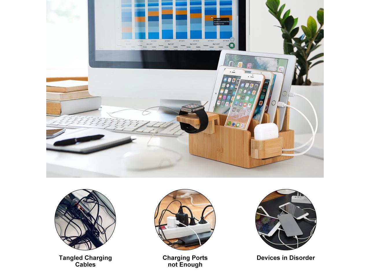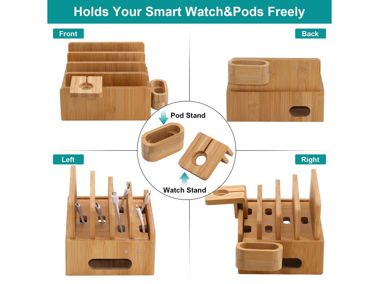 Bamboo Charging Station Organizer, Wood Desktop Docking Charging Stand Compatible with Airpods, iPhone, iPad, Apple Watch (Included 5 Port USB Charger, 6 Charge Sync Cables)