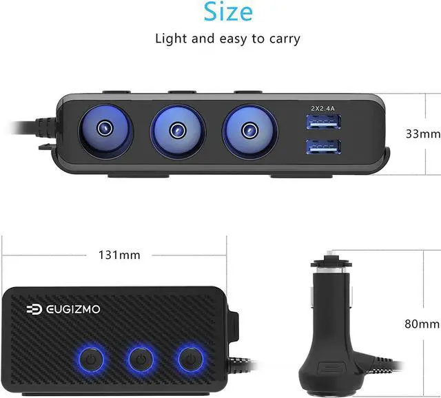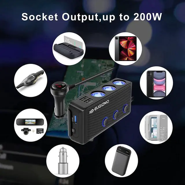 High Power 12/24V Car Cigarette Lighter Adapter EUGIZMO cigarette lighter splitter extend your car cigarette lighter from 1 to 3 sockets. Provide a total power up to 220W, 7 devices can be charged at same time, enough for various high-power automotive appliances, Which perfectly fits with your GPS, Dash Cam, Vacuum Cleaner, Car Fridge, Heated Seats, and Sat Nav ect. (Single socket power is not exceed 120W, support cigarette function.)
