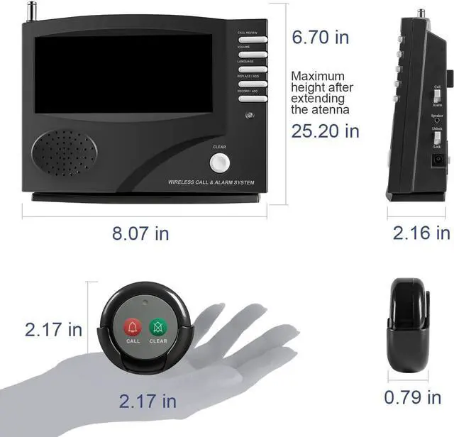 Caregiver pager has operating range up to 660-foot from the panel (the signal range might be affected by the surrounded electronic devices or metal walls); Fully extend the antenna for the most optimal signal range;