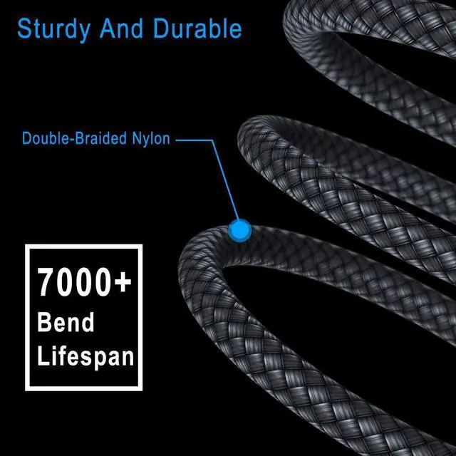 EXTREMELY DURABLE --- Our product is a durable and sturdy cable that you can rely on, with a double-braided exterior and a premium aramid fiber core. It boasts a 7000+ bend-tested lifespan, which enables to endure daily wear and tear. The aluminum alloy connectors also have reinforced necks to reduce damage from bending.