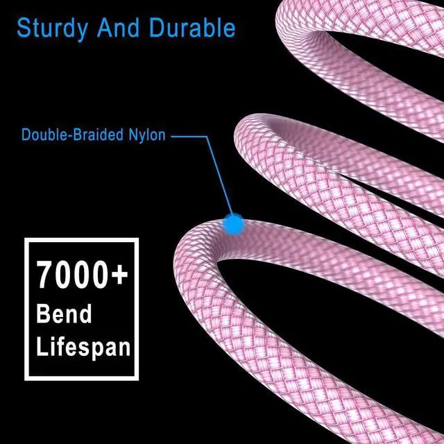 EXTREMELY DURABLE --- Our product is a durable and sturdy cable that you can rely on, with a double-braided exterior and a premium aramid fiber core. It boasts a 7000+ bend-tested lifespan, which enables to endure daily wear and tear. The aluminum alloy connectors also have reinforced necks to reduce damage from bending.