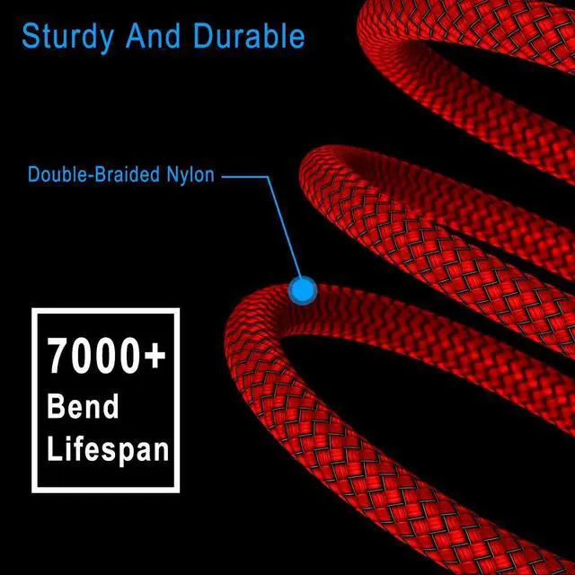 EXTREMELY DURABLE --- Our product is a durable and sturdy cable that you can rely on, with a double-braided exterior and a premium aramid fiber core. It boasts a 7000+ bend-tested lifespan, which enables to endure daily wear and tear. The aluminum alloy connectors also have reinforced necks to reduce damage from bending.