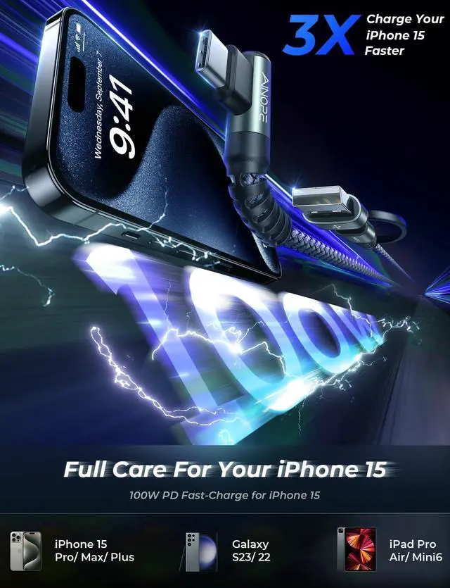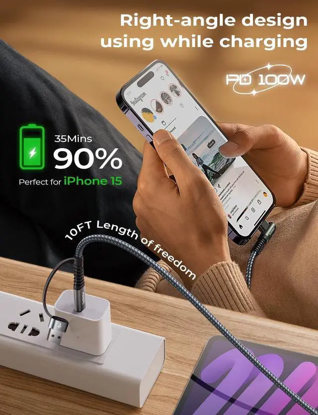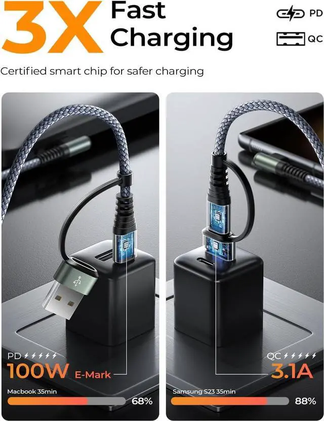 USB C (PD: 100W) to C charger 2 in 1, which means you can use it to connect all your USB C and USB A devices. ainope USB C charging cable 10FT, transfer/charge your device data directly to the latest Type-C laptop/charger. Easy to carry and more convenient to use. No need to worry about the charging port type as it adapts to all charging wall plugs.