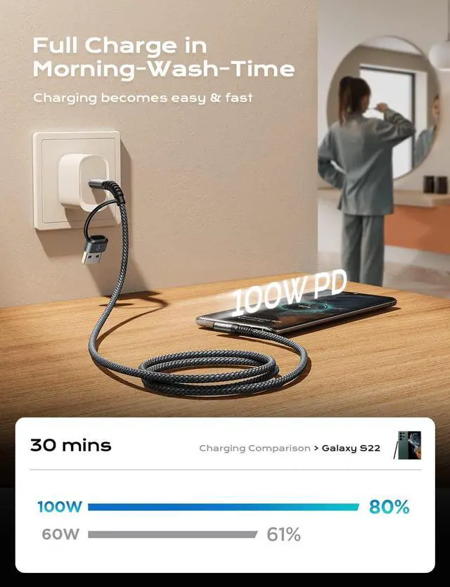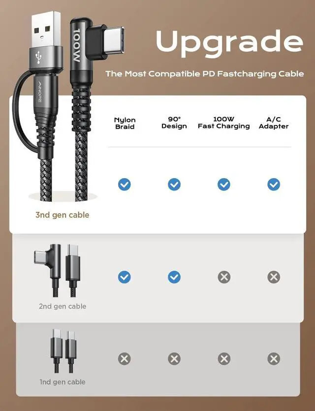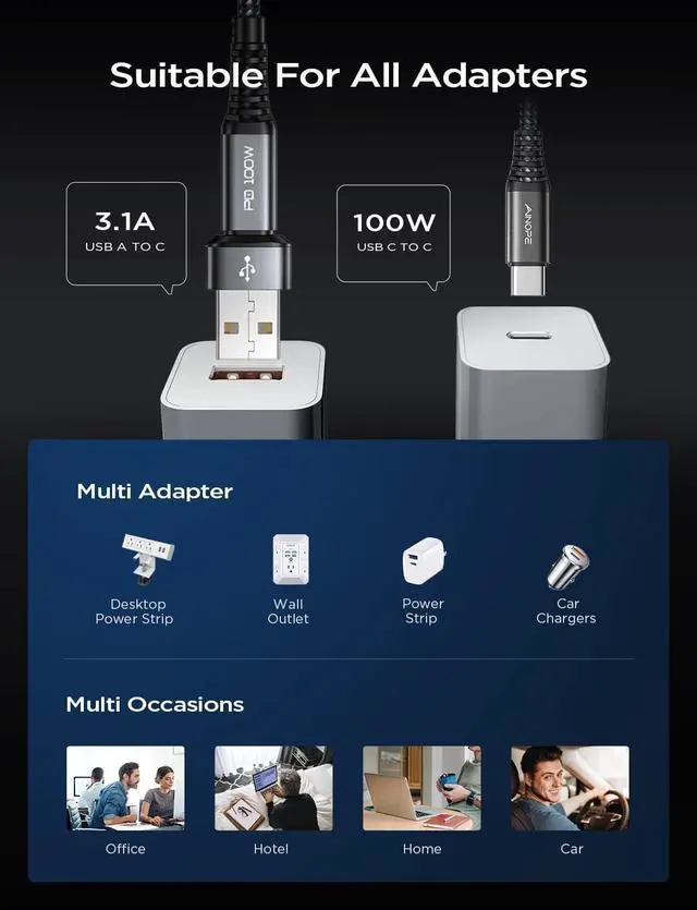 USB C (PD: 100W) to C charger 2 in 1, which means you can use it to connect all your USB C and USB A devices. ainope USB C charging cable 10FT, transfer/charge your device data directly to the latest Type-C laptop/charger. Easy to carry and more convenient to use. No need to worry about the charging port type as it adapts to all charging wall plugs.