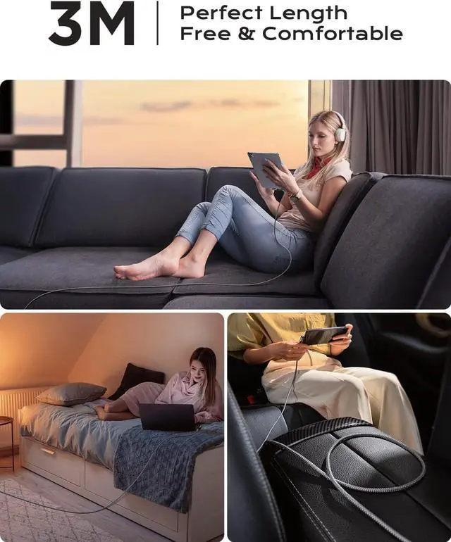 The usb c to usb c cable 10ft has a built-in black technology smart chip, which intelligently regulates the current, and the ultra-long wire does not delay the super fast charger type c. The Multi-port connector lets you enjoy videos or games while lying on the couch. It can be used in different occasions such as bedroom, office or the back seat of the car. In addition, this type c charger fast charging cable with Velcro can be folded to shorten at will.