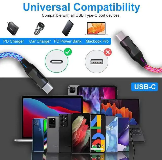 *Universal Compatibility: Our led usb c to type c charging cable is compatible with all Type-C port devices including phone, tablet and laptop. for example compatible with Samsung Galaxy S23/S23+/S23 Ultra/S22/ S22+/ S22 Ultra/ S21/ S21+/ S21 Ultra/ S20/ S20+/ S20 Ultra/ Note 20/ Note 20 Ultra/Note 10/ Note 10+/ A80, Google Pixel 2/3/4/5/6, Macbook Air 13'', iPhone 15 Pro Max Plus/ iPhone 16 Pro Max Plus /iPad Pro 2018/ 2020/ 2021/ 2022, iPad Air 2022(Gen 5th)/2020(Gen 4th), iPad 10th Gen, iPad Mini 6 and more Type-C port devices.
