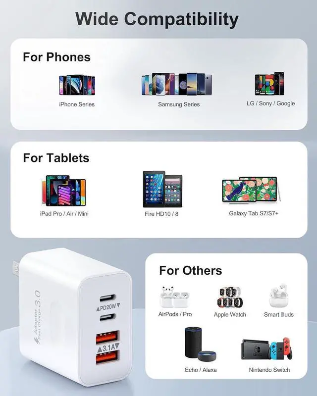 Charger Multiport: Upgraded USB C Charger Block has Dual USB-C ports and Dual USB-A ports. Allow users to charge 4 devices simultaneously to minimize waiting time. Its also a great space saver instead of taking up 4 wall outlet ports. Say goodbye to your original usb chargerSafe and Reliable
