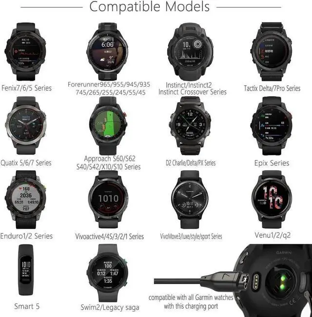 Wide Compatibility -- USB C Charger Charging Cable Compatible with Garmin Fenix 7 7S 7X, Fenix 6 6S 6X, Fenix 5 5S 5X Plus, Vivosmart 5, Forerunner 45 45S 55 245 255 745 935 945 955 965, Approach G12 S10 S12 S40 S42 S60 X10, Vivoactive 3 Music 4 4S, Vivomove 3 3S Style Luxe Sport, Vivosport, Venu 2 plus 2S Sq Music Edition, Instinct Tactical Esports Edition, Instinct Tactical Impact Edition, Instinct Solar Camo Edition...