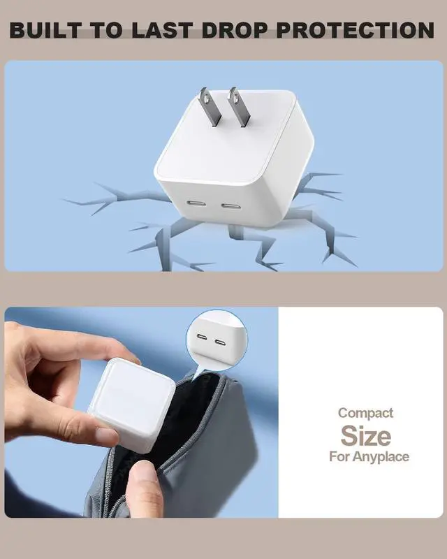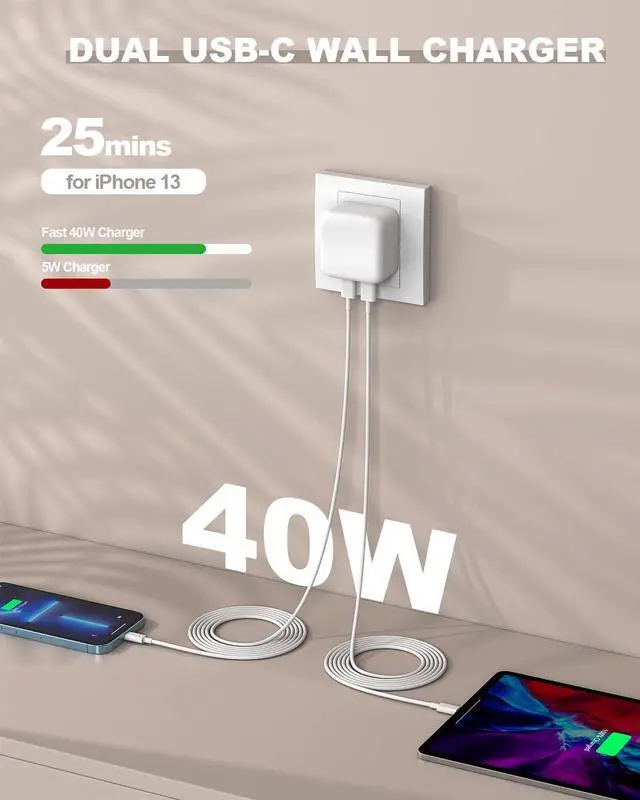 [40W Dual USBC Fast Charger for iPhone 14 13]40W FAST Charger iPhone power delivery iPhone Chagrer with usb-c to Lightning cable fast charging for iPhone 14 or 13 from 0-50% within 25 mins faster than an original 5W charger. Lightweight and foldable design prongs for travel and portability. [Safe Charging Dual USB-C Ports for 20W Per Port]Super Quick 40w iPhone Charger with 20w per usbc port? ê? each output provide 20W of charging power to charge 2 devices simultaneously. World standard MFi & UL certificated provides a much more faster charging speed for your iPhone/iPad.