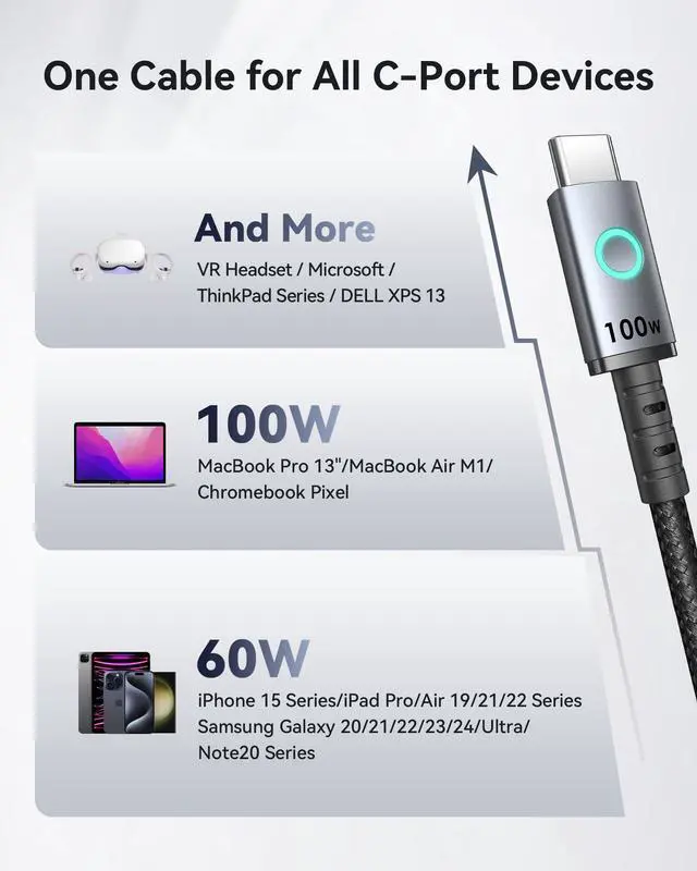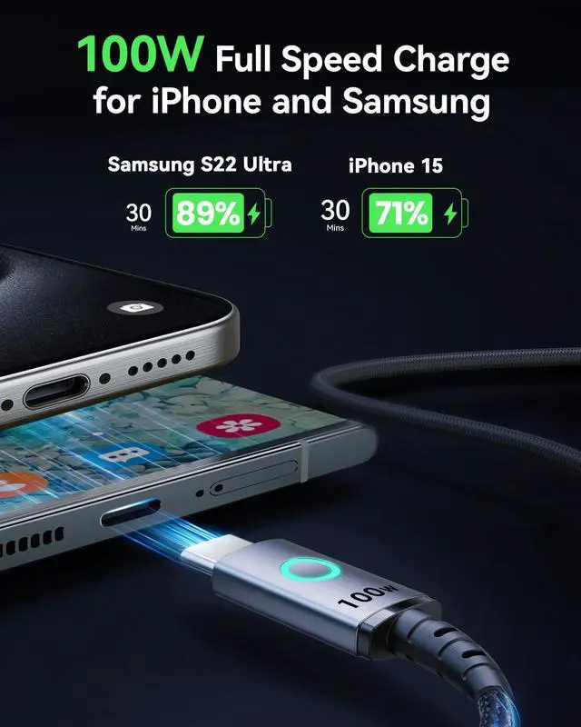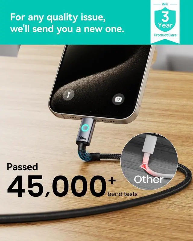 INIU Leopard Cable 100Wyour ultimate charging solution! This USB-C to USB-C cable powers your MacBook Pro 16 to 60% in just 45 minutes58% faster than a 60W cable. Charge your iPhone 15 to 60% in 25 minutes, and your Samsung Galaxy S22 Ultra to 89% in just 30 minutes. With 100W output, its compatible with a wide range of devices. Plus, its FLYWEAVE braided nylon ensures 20X durability, while the Emark 2.0 chip enhances safety for worry-free charging! What's more, you are also back up with industry-leading 3-year warranty!