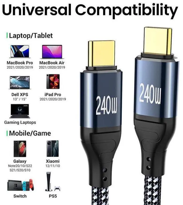 [Compatible with All C-Port Devices] Our 240W usb c cable fit for all C-port devices, downward compatible 200W/170W/140W/100W/60W/45W/30W/25W/18W and more. Can full speed charging for all your C-port laptop, tablet, phone and gaming devices.