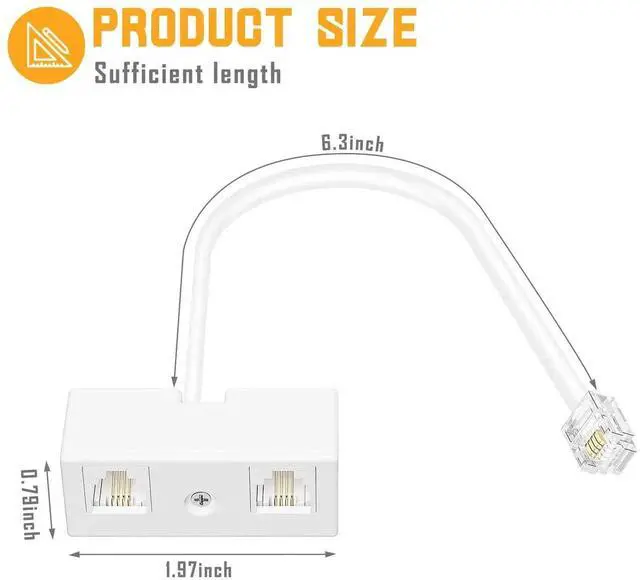 Two Way Telephone Splitter: Specially designed 2 way RJ11 6P4C splitter lets you plug in two phone devices to one wall jack. It allows two telephones or modems with US plug to connect to a single US telephone socket