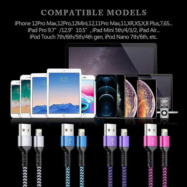 [WIDELY COMPATIBLE] - certified lightning cable work For iPhone 14/13/13 Mini/13 Pro/13 Pro Max/12/SE/11 Pro Max/11 Pro/11/XR/XS Max/XS/X/8 Plus/8/7 Plus/7/SE/6S Plus/6/5C/5S/5; iPad Pro 9.7 ''/ 12.9 ''/11''/ 10.5 '' iPad Mini 5th/4/3/2 iPad Air 4 3 2 iPad Wi-Fi+Cellular; Pod Touch 7th/6th/5th/4th gen Pod Nano 7th/6th as good as the original.
