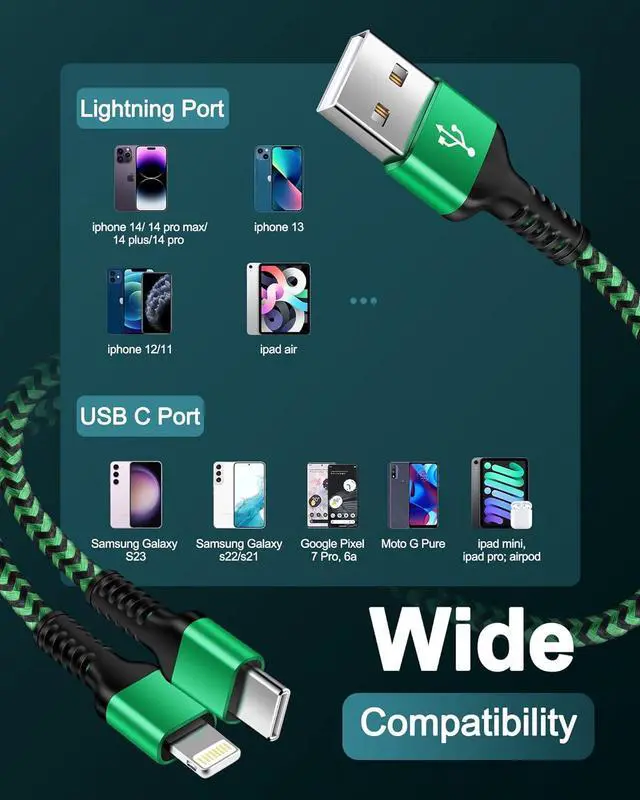 Wide Compatibility: usb c and lightning cable 2 in 1 perfect fit for all lightning/ USB type c port devices. The lightning port is compatible with iPhone 14 Pro Max 14 Plus 14 Pro 13 12 Pro Max 12 mini SE 2 11 Pro Max XR X 8plus 8 7 XS 7plus 6s iPad Air/mini; And the usb-c port is the perfect fit for iPhone 16 15 15 Pro 15 Plus 15 Pro Max Galaxy S25 S24 S23 S22 S21 S20 ultra s10 note 9 a25 a13 a03s z flip fold 7/6/5/4 Pixel 9 Pro 8a 8 7a 7 Pro 6a 5 XL LG Moto and moreOne-for-Two