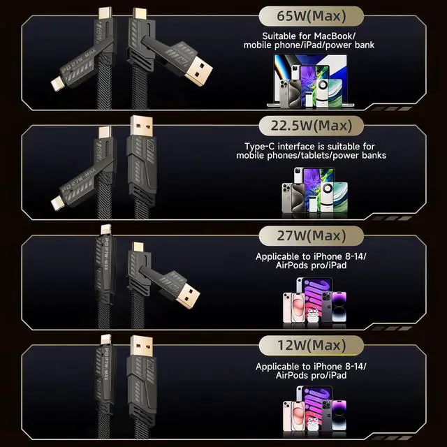 About Wide Compatibility: This 4 in 1 usb fast charging cables can charge all Android phones/ iphones such as iphone 16/15/14/13/12/11 Plus Pro Max tablets laptops pads headphones gaming consoles etc. You can use this multi iphone/pad charger cord whether your charger adapter is USB A or USB C.